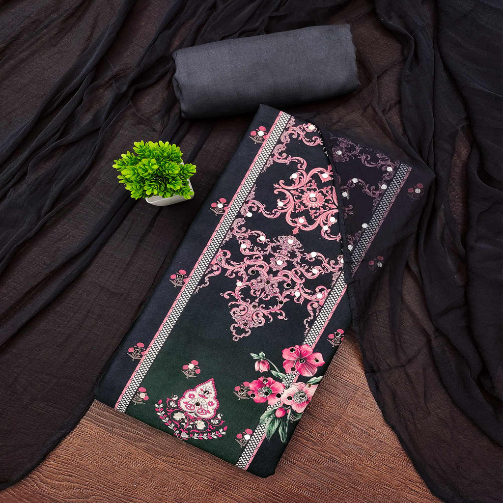 Chikoo Bloom Charm With Floral Print & Delicate Sequins & Moti Handwork Dress Material