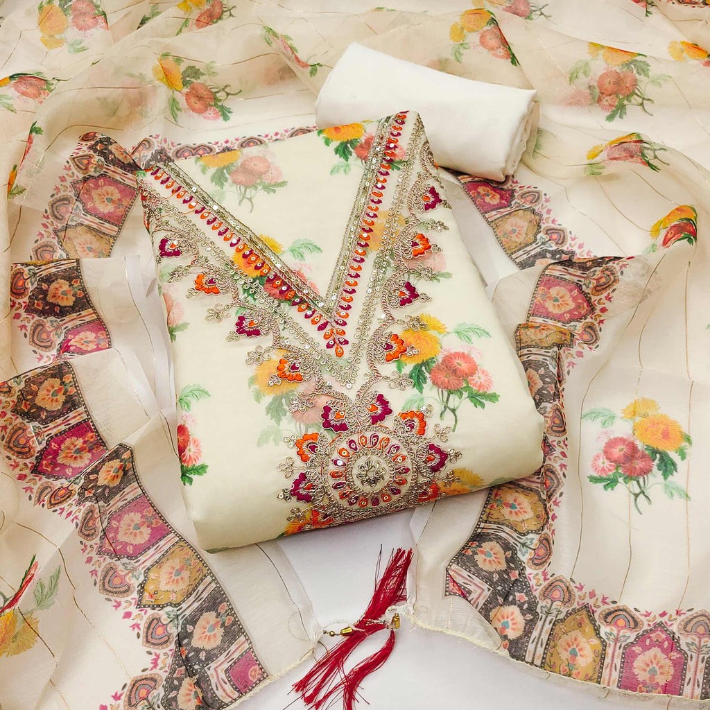 Mustard Bloom Charm With Floral Print & Delicate Sequins & Moti Handwork Dress Material