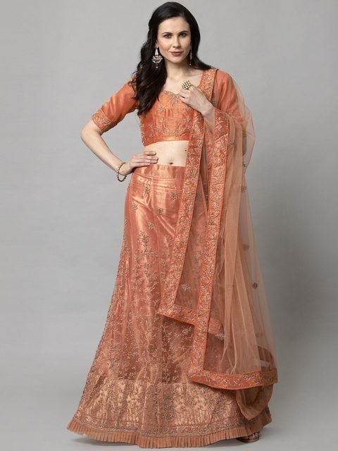 Peach-coloured embellished semi-stitched lehenga, flared hem, drawstring closure