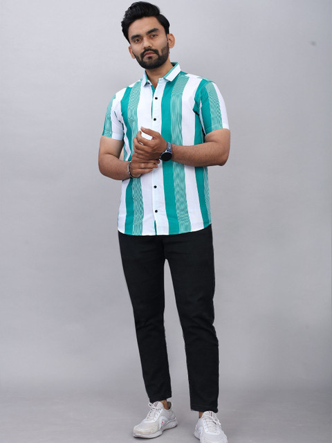 Teal vertical stripes striped opaque Casual shirt ,has a spread collar, button placket, na pocket, short regular sleeves, straight hem