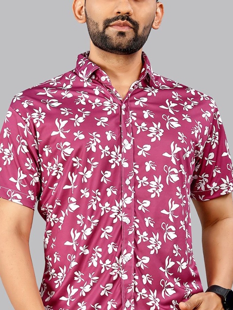 Pink, white floral printed casual shirt ,has a spread collar, button placket, short sleeves, curved hem