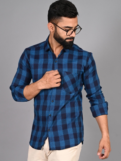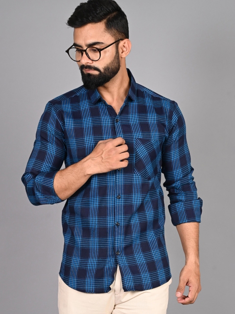 Navy blue & blue tartan checked opaque casual shirt ,has a spread collar, button placket, 1 patch pocket, long regular sleeves, curved hem
