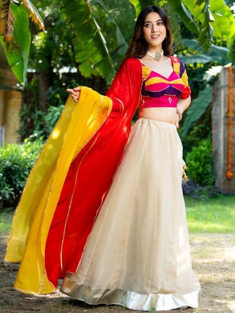 WHITE FIRE Women Red Embroidered Beads and Stones Semi-Stitched Lehenga Choli & Dupatta