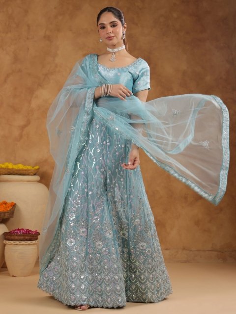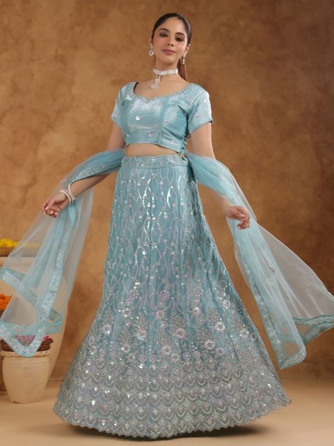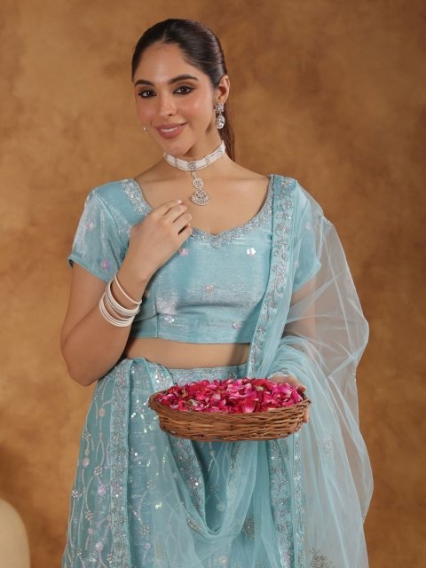 6Y COLLECTIVE Turquoise Blue & Gold-Toned Embroidered Sequinned Semi-Stitched Lehenga & Unstitched Blouse