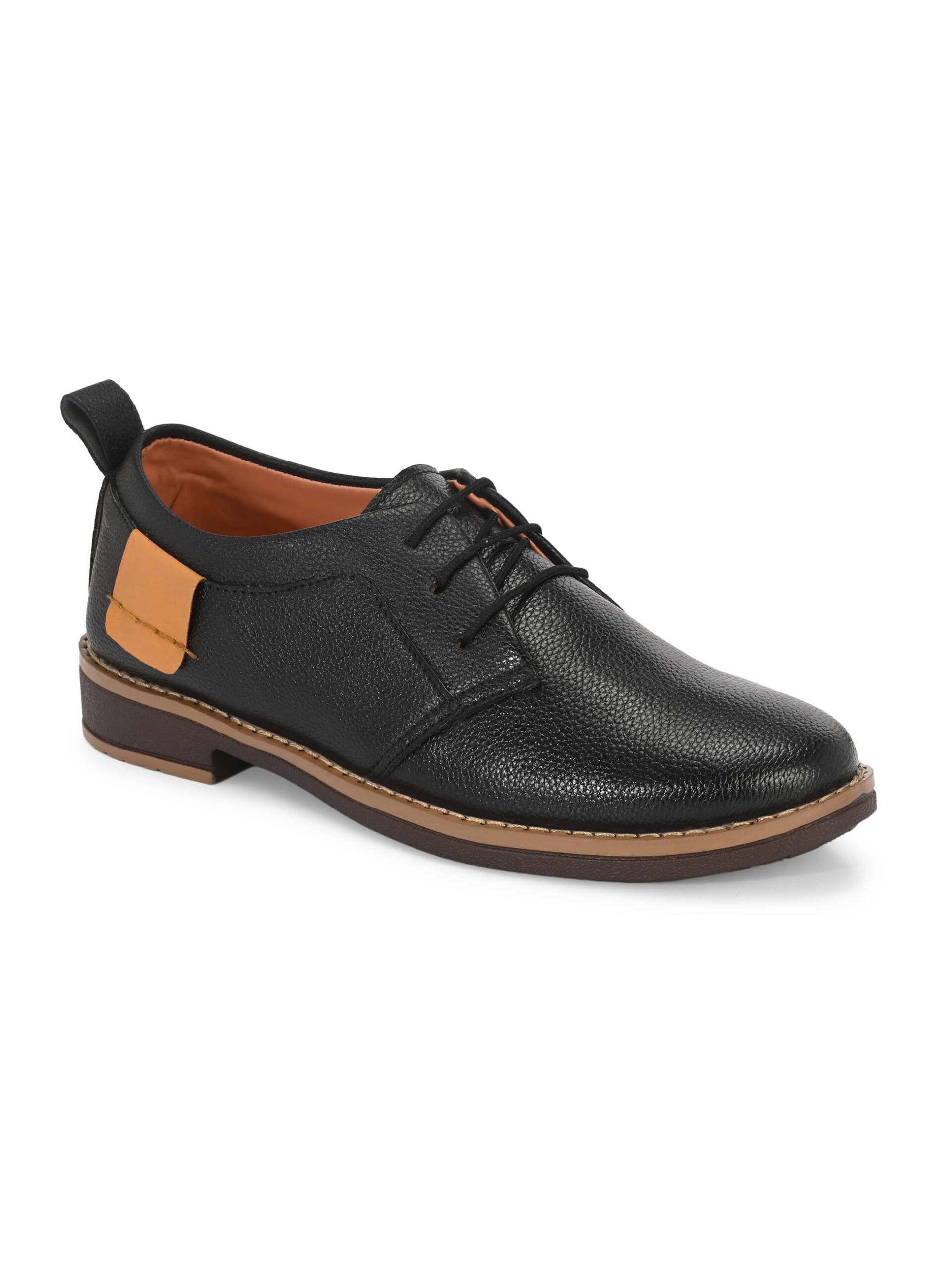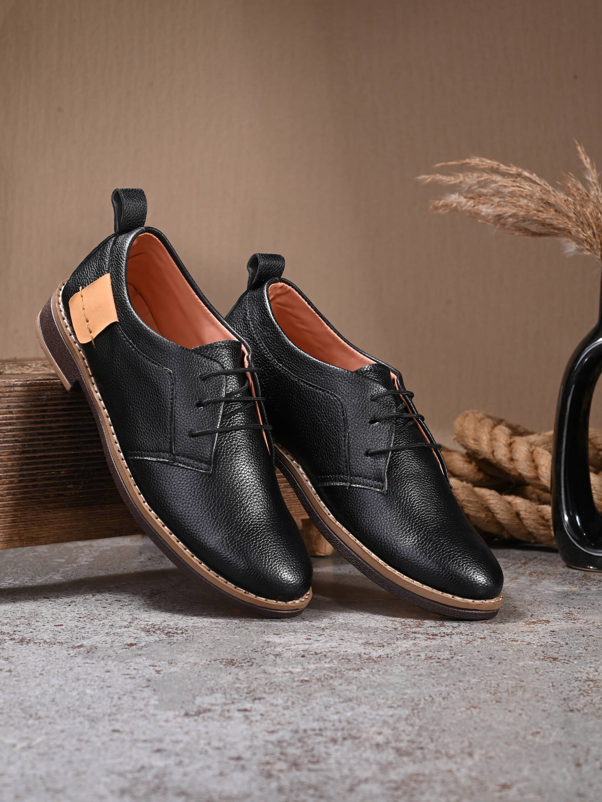 These men’s formal Derby shoes showcase a classic black textured finish, complemented by tan accents and a sturdy sole. Perfectly crafted for elegance and comfort, they are ideal for professional and formal occasions
