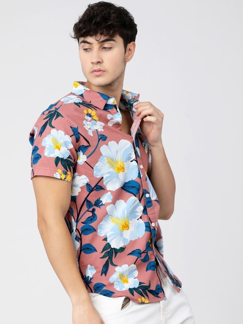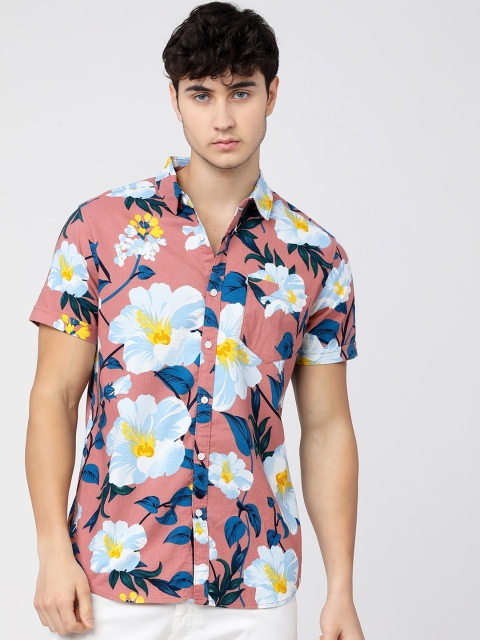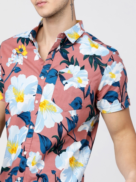 Rust floral printed opaque Casual shirt ,has a spread collar, button placket, 1 patch pocket, short regular sleeves, curved hem