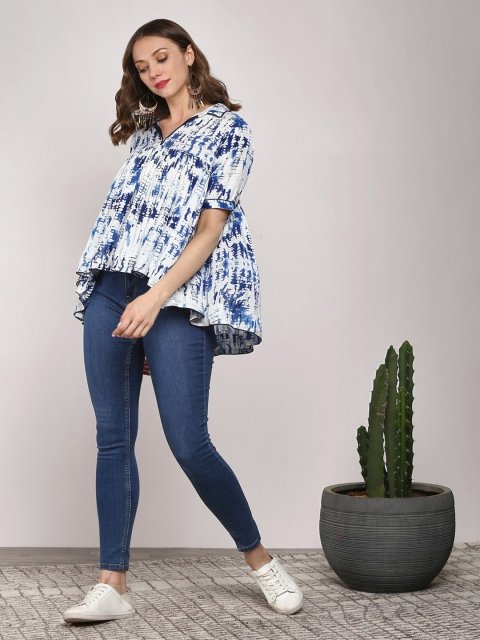 QOMN Blue Print Mandarin Collar Empire Pure Cotton Longline Top