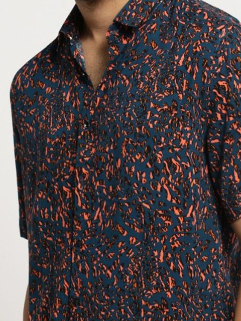 Navy blue floral printed opaque Casual shirt ,has a button-down collar, button placket, na pocket, short regular sleeves, curved hem