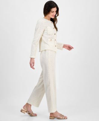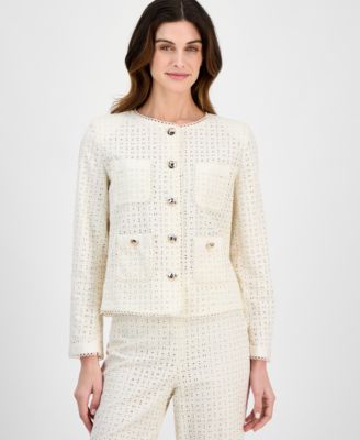 Crisp cotton eyelet is accented by delicate picot trim and dimensional gold-tone buttons on this Anne Klein jacket that brings a pretty perspective to workday dressing.